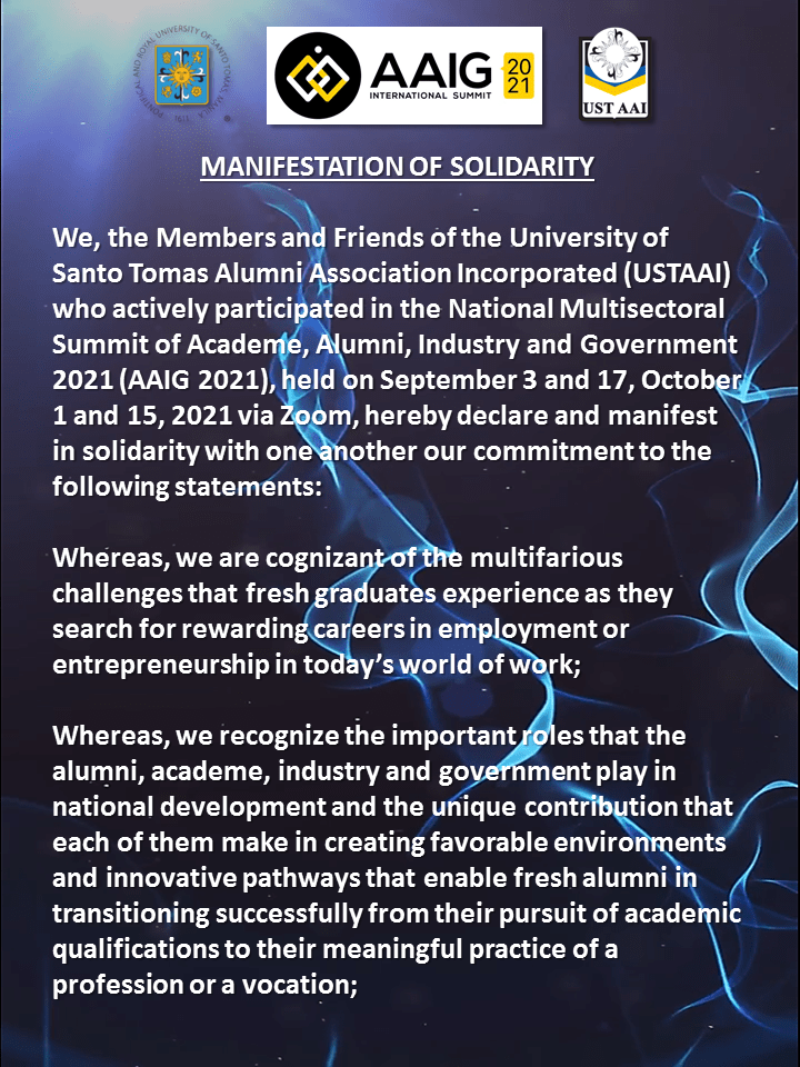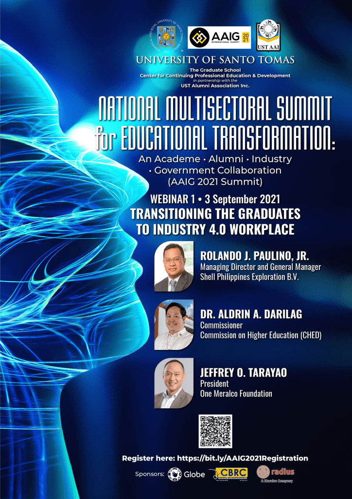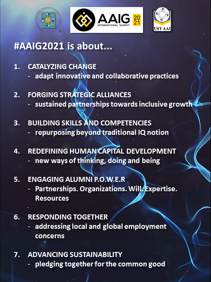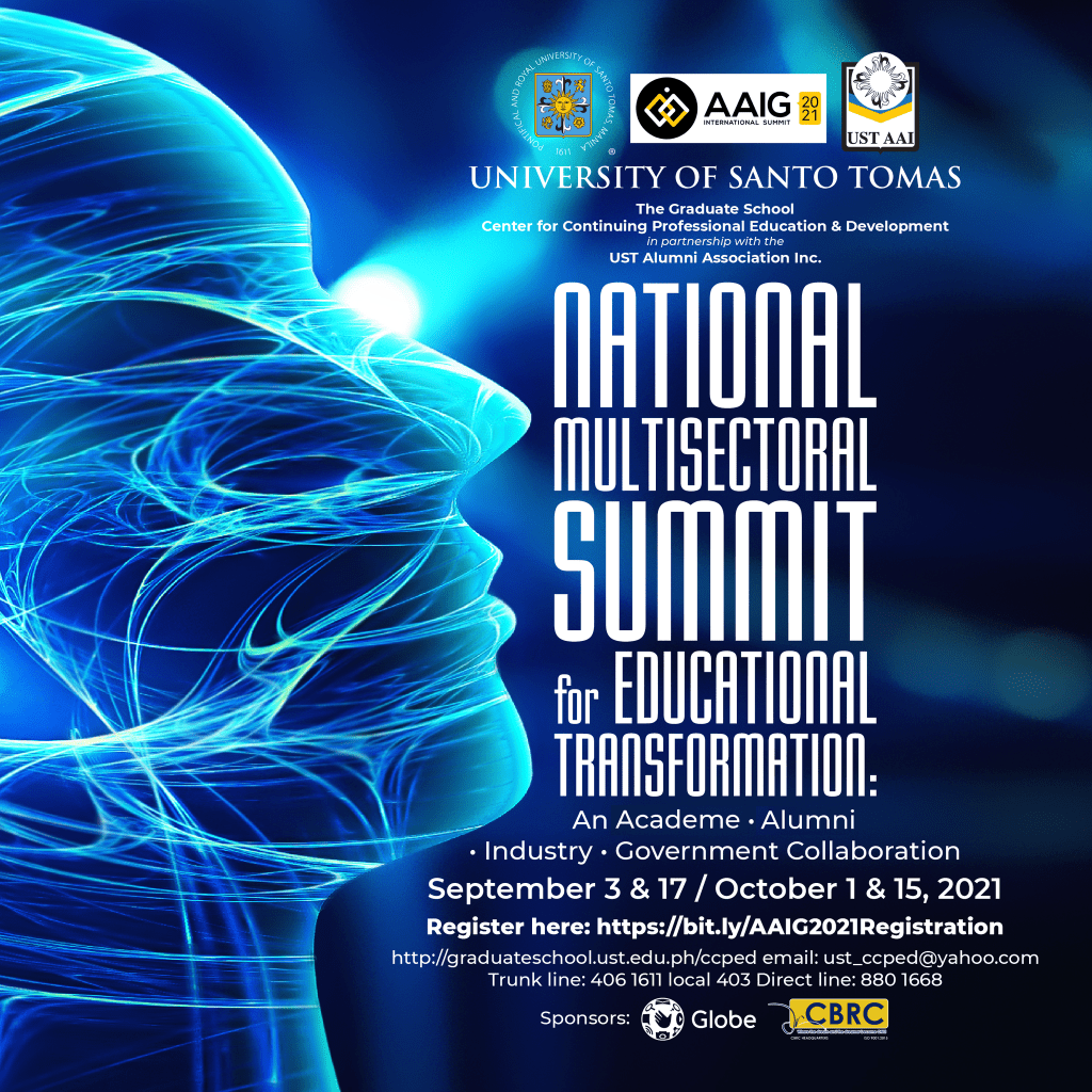 As a follow through of the ” Academe, Alumni, Industry and Government” or AAIG Summit in February 2019, the USTAAI and UST GS CCPED deems it fit to embark on the National Multisectoral Summit for Educational Transformation: An Academe – Alumni – Industry – Government Collaboration (AAIG 2021) to call for the Commission of Higher Education (CHED) , Department of Education (DepEd), Technical Education and Skills Development Authority (TESDA), basic and tertiary education institutions, industry, and government agencies to forge a common innovative pathway to inclusive and sustainable life success for the alumni and development for the country.