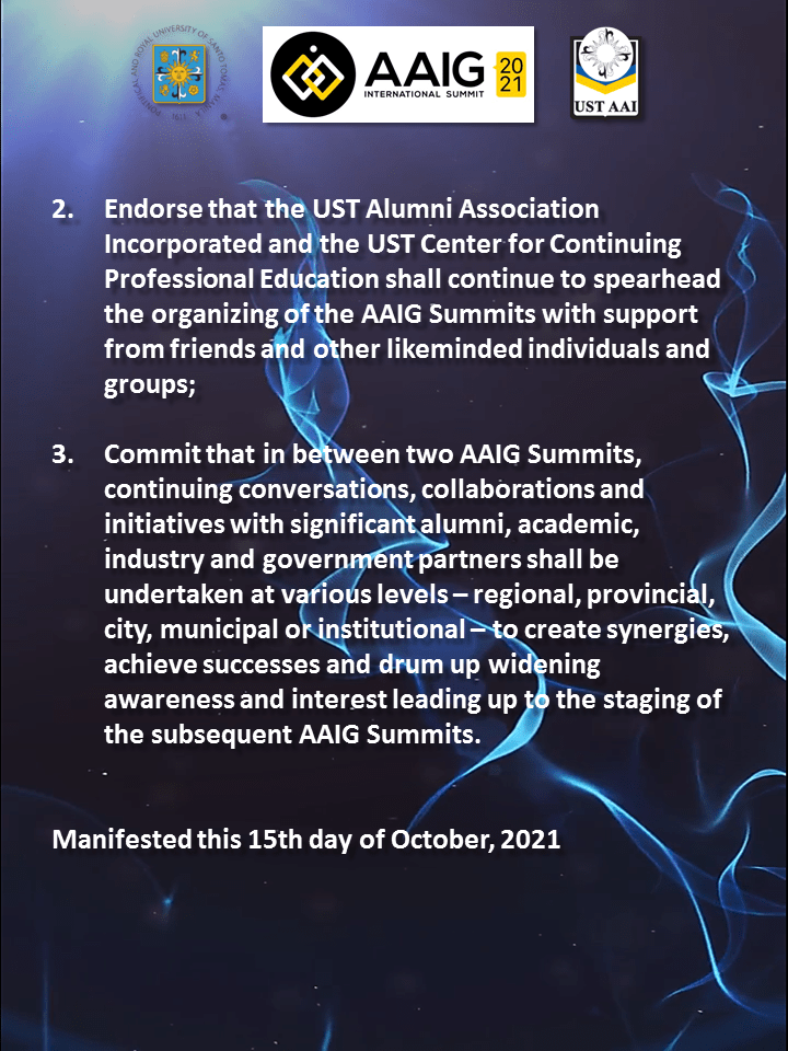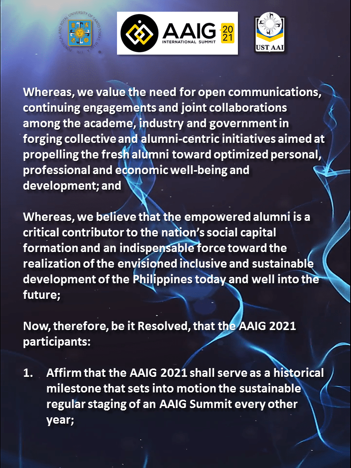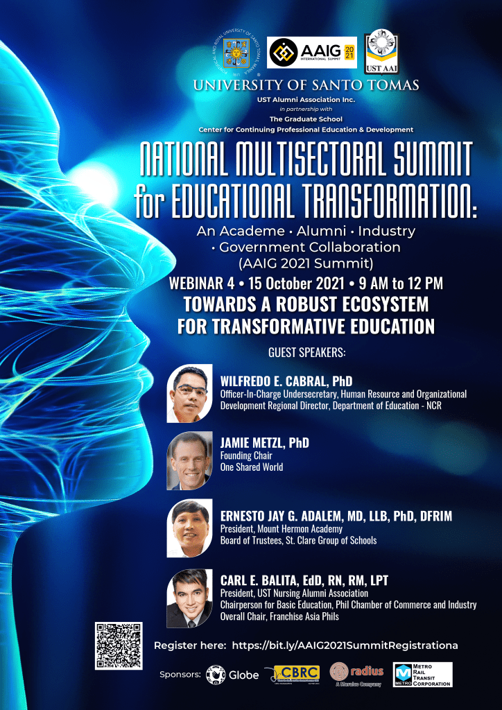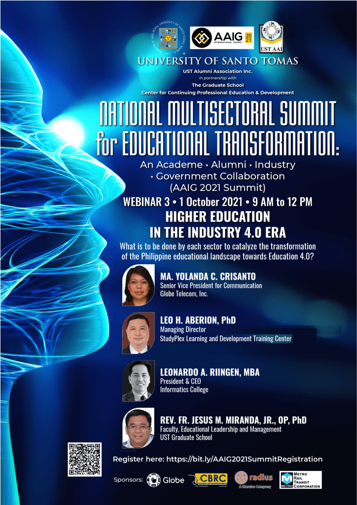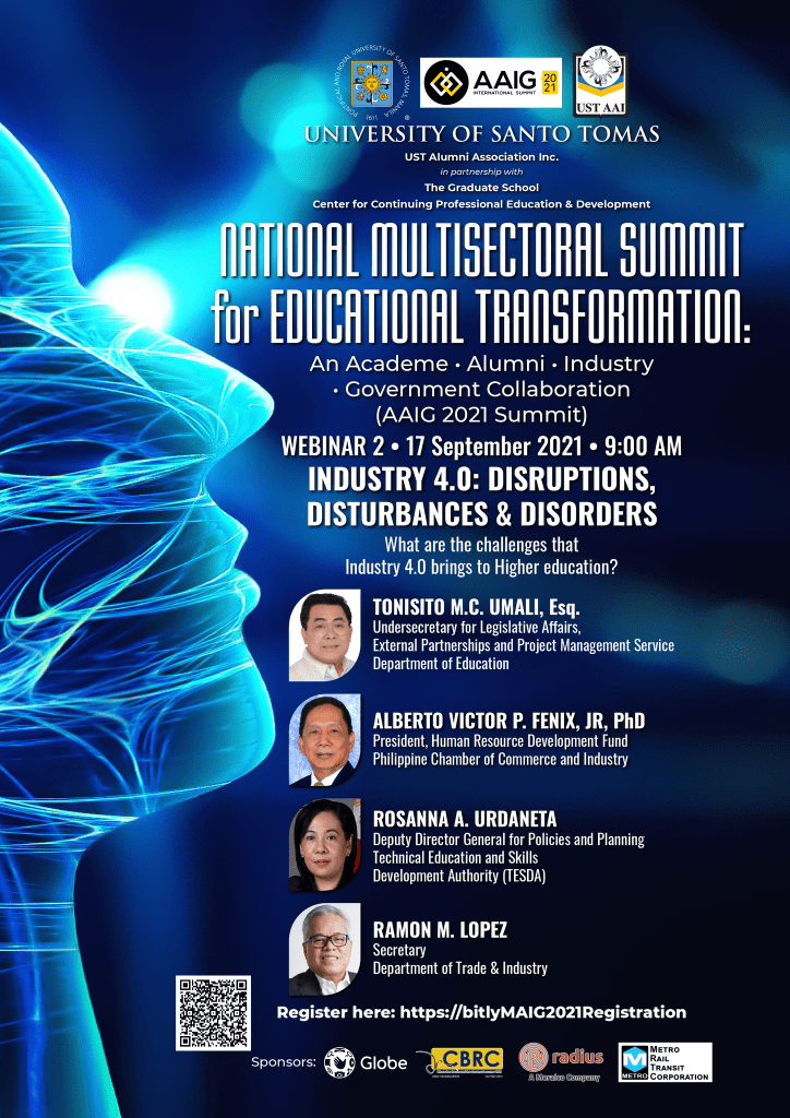 As a follow through of the ” Academe, Alumni, Industry and Government” or AAIG Summit in February 2019, the USTAAI and UST GS CCPED deems it fit to embark on the National Multisectoral Summit for Educational Transformation: An Academe – Alumni – Industry – Government Collaboration (AAIG 2021) to call for the Commission of Higher Education (CHED) , Department of Education (DepEd), Technical Education and Skills Development Authority (TESDA), basic and tertiary education institutions, industry, and government agencies to forge a common innovative pathway to inclusive and sustainable life success for the alumni and development for the country.
