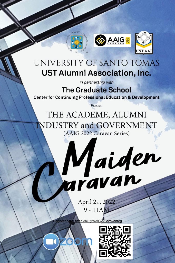 The University of Santo Tomas Alumni Association, Inc. has formally launched the run of its Alumni, Academe, Industry and Government (AAIG) 2022 Caravan Series to be held in five strategic areas in the country, namely: NCR, CALABARZON, Cordillera Administrative Region (CAR), Visayas and Mindanao. The maiden online caravan is slated on April 21, 2022.