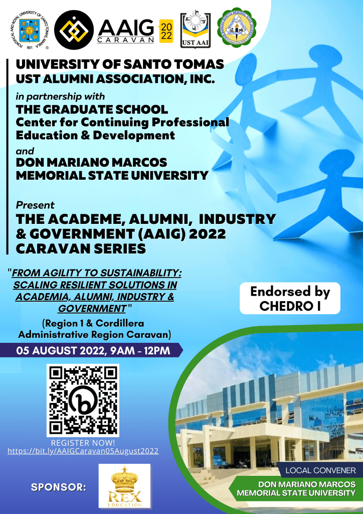 The AAIG 2022 Caravan Region 1 & Cordillera Administrative Region (CAR) is scheduled on AUGUST 5, 2022 from 9:00AM TO 12:00NN, with the theme “From Agility to Sustainability: Scaling Resilient Solutions in Academia, Alumni, Industry, and Government.” The host and local convenor for this FREE webinar is Don Mariano Marcos Memorial State University, La Union. THIS EVENT HAS BEEN ENDORSED BY CHED! This WEBINAR is open to ALL Thomasians and Non-Thomasians—not only from Region 1 / CAR, but worldwide.