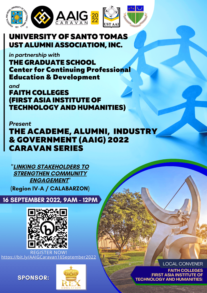 The AAIG 2022 Caravan Region IV-A / CALABARZON is scheduled on SEPTEMBER 16, 2022 from 9:00AM TO 12:00NN, with the theme “Linking Stakeholders to Strengthen Community Engagement” The host and local convenor for this FREE webinar is FAITH Colleges (First Asia Institute of Technology and Humanities). This WEBINAR is open to ALL Thomasians and Non-Thomasians—not only from Region IV-A / CALABARZON, but worldwide.