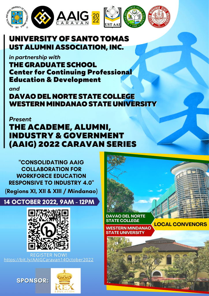 The AAIG 2022 Caravan Regions XI, XII & XIII (MINDANAO) is scheduled on OCTOBER 14, 2022 from 9:00AM TO 12:00NN, with the theme “Consolidating AAIG Collaboration for Workforce Education Responsive to Industry 4.0” The hosts and local convenors for this FREE webinar are Davao del Norte State College and Western Mindanao State University. This WEBINAR is open to ALL Thomasians and Non-Thomasians—not only from Regions XI, XII & XIII (MINDANAO), but worldwide.